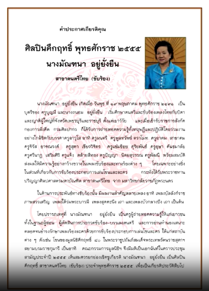 • ร่วมขับร้องและบรรเลงดนตรีกับนักดนตรีไทยอาวุโสแห่งกรุงรัตนโกสินทร์ “วิศิษฏศิลปิน” ณ หอประชุมใหญ่ ศูนย์วัฒนธรรมแห่งประเทศไทย