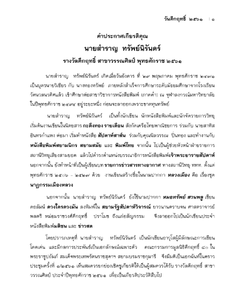 รางวัลคึกฤทธิ์ ประจำปี 2561 - สาขาวรรณศิลป์